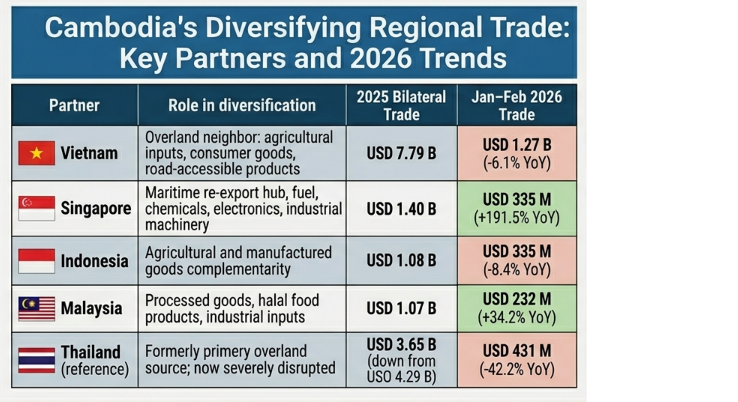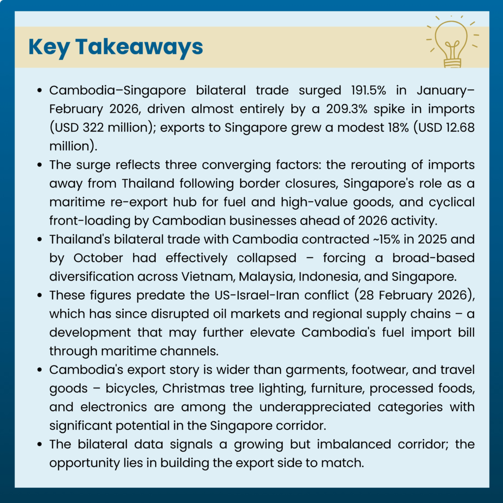 These figures cover January–February 2026 – before the outbreak of the US-Israel-Iran conflict on 28 February 2026, which has since triggered significant disruptions to global oil and gas markets, shipping costs, and regional supply chains. Given that fuel and petroleum products constitute a significant component of Cambodia’s Singapore imports, the downstream effects of the conflict on this corridor will be important to monitor. If energy prices remain elevated and freight costs rise, the import bill through Singapore could increase further even without a corresponding rise in volumes, widening the bilateral deficit.