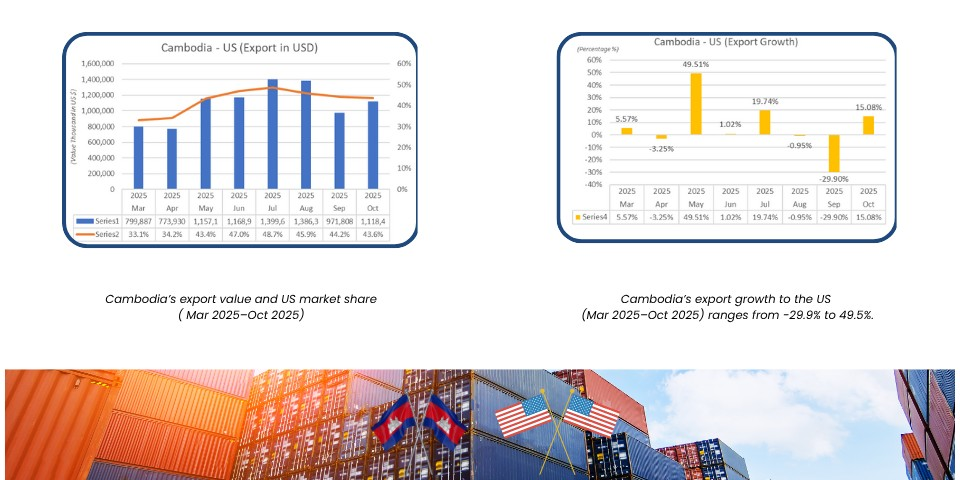 The US market is, and remains, Cambodia’s largest export destination, with its share of total exports rising from 33.1% in March to 48.7% in July, before moderating to 43.6% in October. This demonstrates Cambodia’s economic resilience and continued appeal  as an export-oriented manufacturing base during the period of policy adjustment.