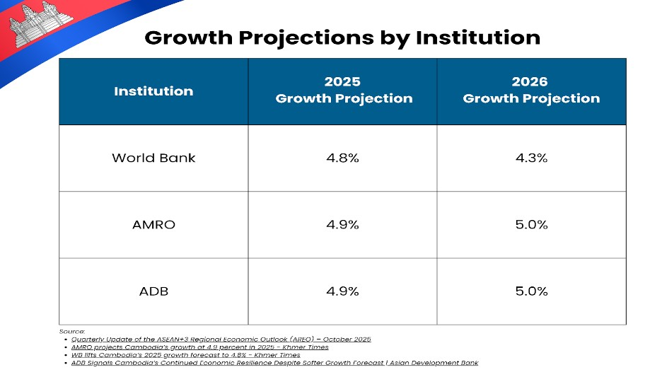 Cambodia’s economy is projected to grow between 4.8-4.9% in 2025, according to assessments from the World Bank, ASEAN+3 Macroeconomic Research Office (AMRO), and Asian Development Bank (ADB). Growth is expected to moderate in 2026, with projections ranging from 4.3% to 5.0%.